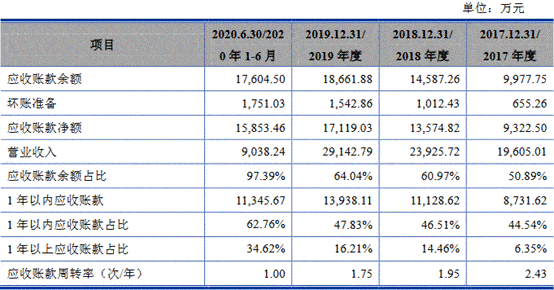 2016年、2017年、2018年、2019年和2020年1-6月,艾隆科技应收账款(含合同资产)余额分别为6180.41万元、9977.75万元、1.46亿元、1.87亿元和1.76亿元,占营业收入比例分别为37.70%、50.89%、60.97%、64.04%、97.39%。