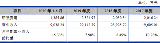2016年、2017年、2018年、2019年和2020年上半年,艾隆科技研发费用分别为1536.45万元、2016.24万元、2030.34万元、2324.97万元和1385.86万元,占营业收入的比例分别为9.37%、10.28%、8.49%、7.98%和15.33%。