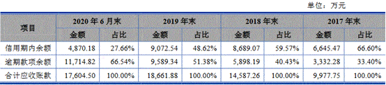 截至2017年末、2018年末、2019年末和2020年6月末,艾隆科技逾期应收账款余额分别为3332.28万元、5898.19万元、9589.34万元和1.17亿元,占比分别为33.40%、40.43%、51.38%和66.54%。
