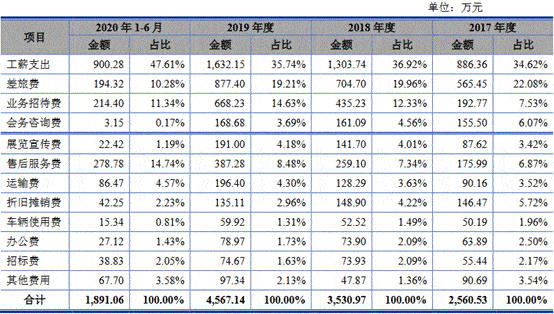 艾隆科技销售费用主要由工薪支出、差旅费、业务招待费、售后服务费、会务咨询费构成,过去四年及一期,五项费用合计占销售费用的比例超过75%。