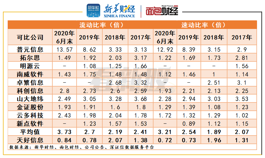 截至2020年6月末,天好信息流动比率为0.84倍,速动比率为0.72倍,均低于同行业可比公司均值。