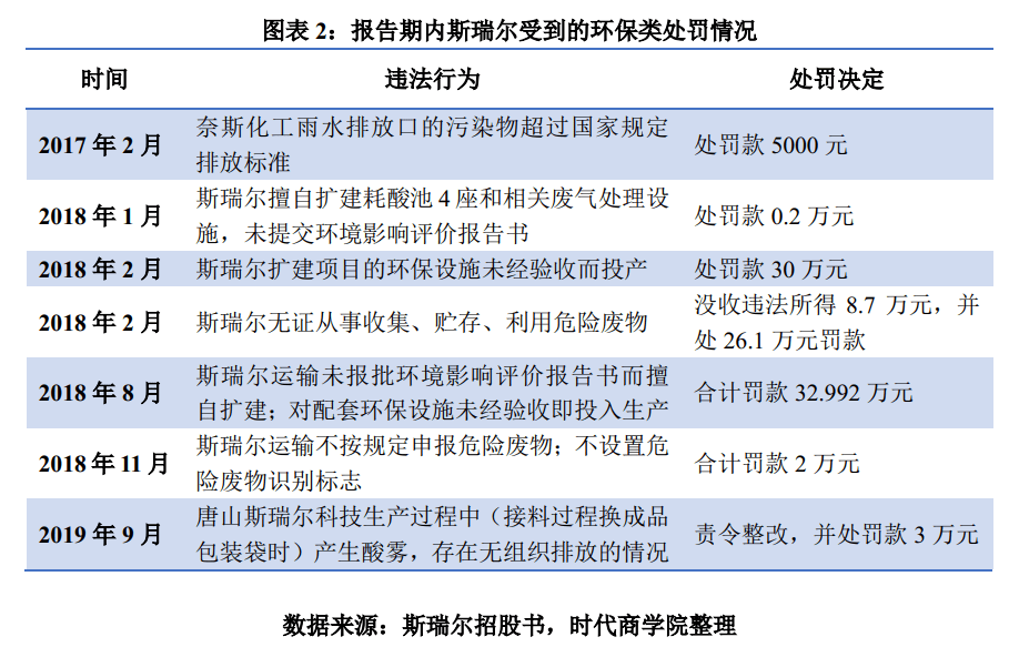 如图表2所示,2017年2月,奈斯化工因雨水排放口的污染物超过国家规定排放标准,被处罚款5000元;2018年,斯瑞尔因违规扩建、无证处理危险废物等违法行为受到5次行政处罚,合计被处罚款90余万元;2019年9月,唐山斯瑞尔科技(斯瑞尔二级全资子公司)因生产过程中(接料过程换成品包装袋时)产生酸雾,存在无组织排放的情况,被处罚款3万元。