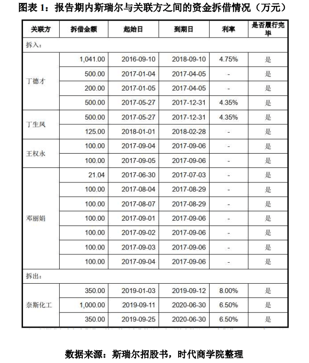 报告期内,斯瑞尔多次与关联方丁德才、丁生凤、王权永、邓丽娟等拆借资金,并且存在未签订借款协议和约定利息的情形。如图表1所示,2017年1—4月,斯瑞尔合计向丁德才借款700万元,但并未签订借款协议和约定利息;2017年9月1—4日,斯瑞尔合计向邓丽娟借款达400万元,同样未签订借款协议和约定利息。