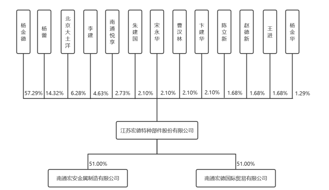 宏德股份控股股东为杨金德,实际控制人为杨金德和杨蕾父女。本次发行前,杨金德直接持有公司57.29%的股份,通过南通悦享间接持有公司0.04%的股份,杨蕾直接持有公司14.32%的股份,两人直接或间接合计持有公司71.65%的股份。此外,杨金德通过控制南通悦享间接控制公司2.73%的表决权股份,杨金德和杨蕾合计控制的表决权股份占公司发行前总股本的74.34%,为公司共同实际控制人。