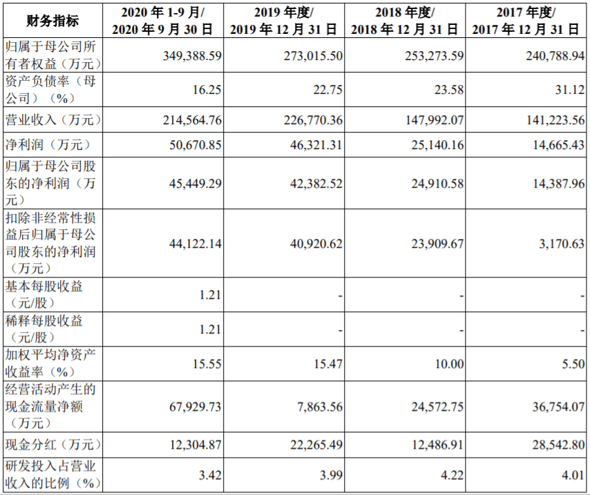 财务数据显示,公司2017年、2018年、2019年、2020年前9月营收分别为14.12亿元、14.80亿元、22.68亿元、21.46亿元;同期对应的归属于母公司股东的净利润分别为1.44亿元、2.49亿元、4.24亿元、4.54亿元。