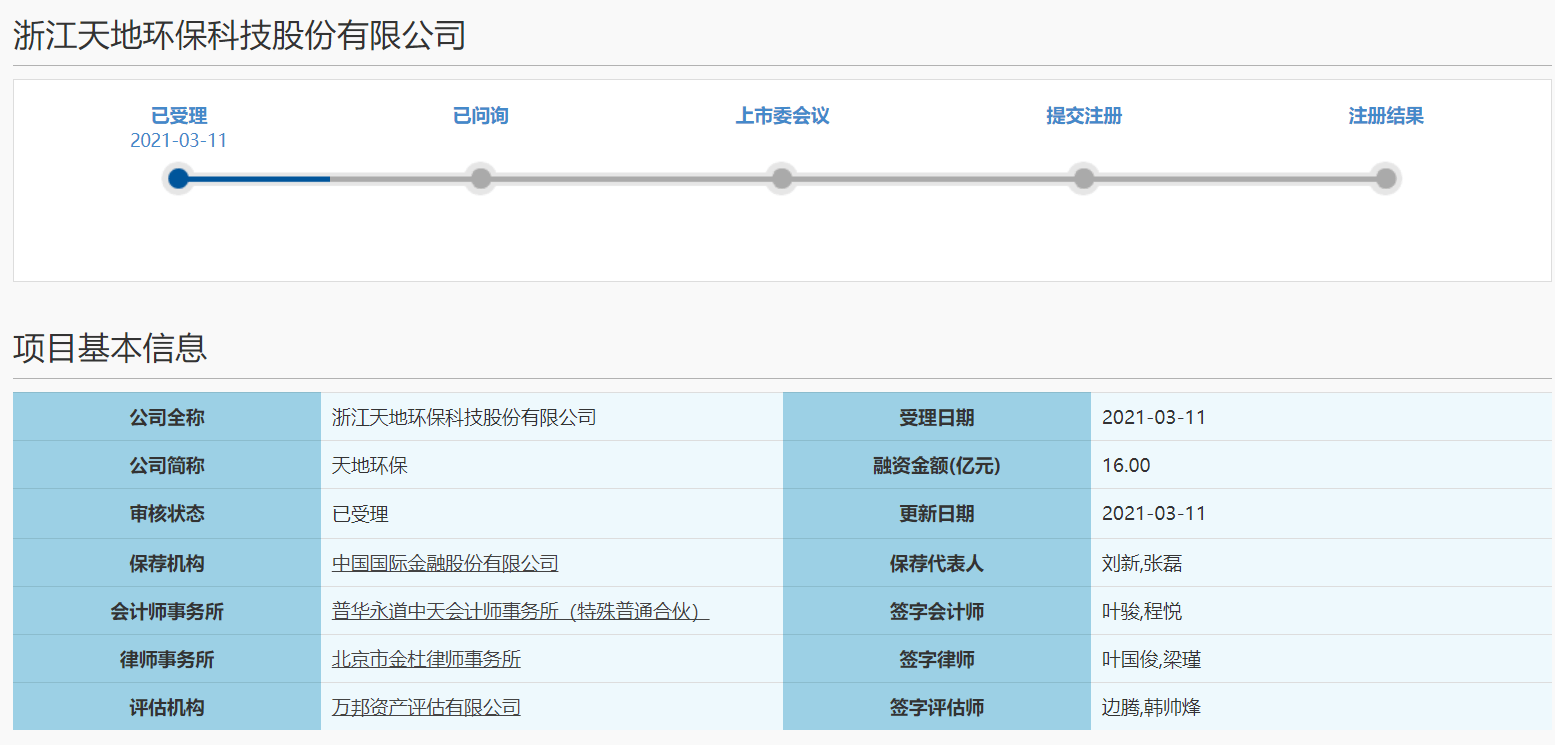 3月11日晚间,浙江天地环保科技股份有限公司(下称“天地环保”)的IPO申请获上交所受理,公司拟发行不超过12,500万股,且不低于本次发行后公司总的10%。