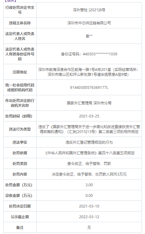 深圳市中芯供应链公司违法遭罚 违反外汇登记管理规定