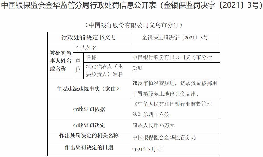 中国经济网北京3月12日讯 中国银保监会网站今日公布的金华监管分局行政处罚信息公开表(金银保监罚决字〔2021〕3号)显示,中国银行股份有限公司义乌市分行(以下简称“中国银行义乌分行”)违反审慎经营规则,贷款资金被挪用于置换股东土地出让金支出。