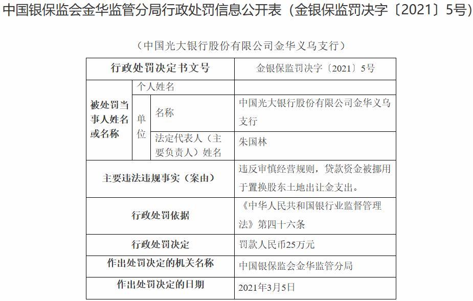 光大银行义乌违法遭罚 贷款被挪用置换股东土地出让金