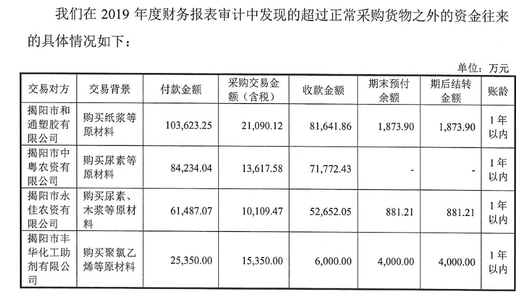据专项说明公告,2019年广东榕泰向揭阳市和通通塑胶有限公司购买纸浆等原材料,向其付款金额合计103,632.25万元,而实际采购交易金额仅21,090.12 万元,实际付款超出了实际交易金额多达8.25亿元。