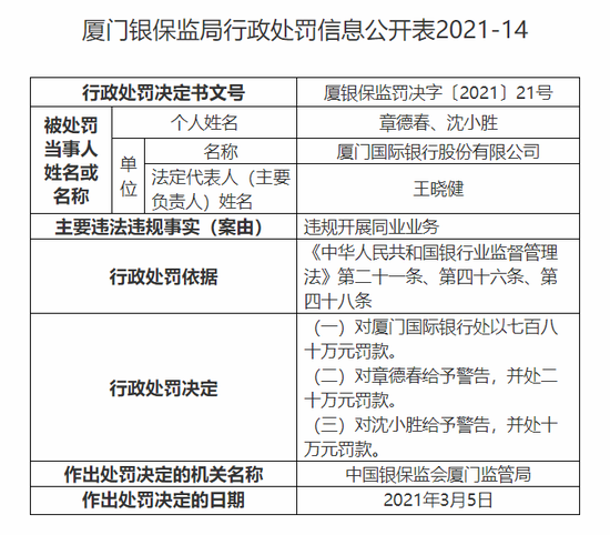 3月12日消息,厦门银保监局今日公布的行政处罚信息公开表显示,厦门国际银行股份有限公司因违规开展同业业务,被处罚款780万元。同时,相关责任人章德春、沈小胜受到警告处分并分别被罚20万元、10万元。
