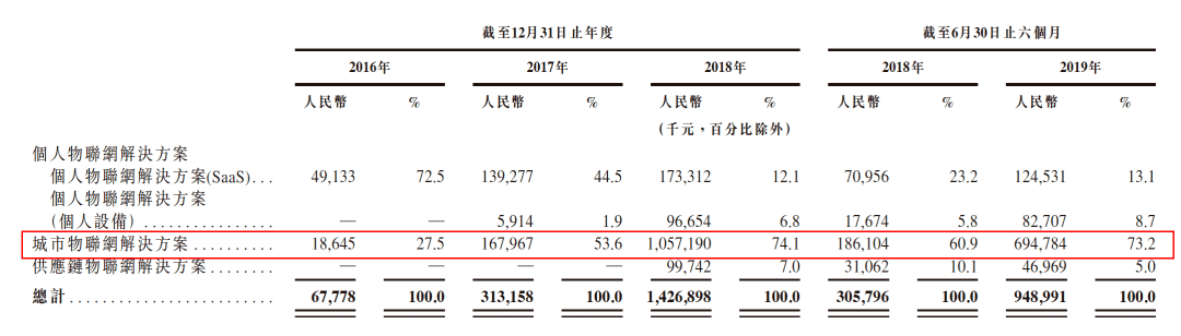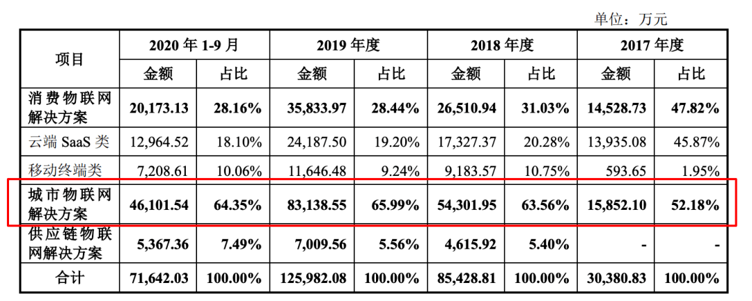 以2018年收入为例,此前港股招股书披露城市物联网解决方案全年实现营业收入10.57亿元,占比总收入比例为74.1%;但在最新A股招股书中,2018年全年该业务实现营业收入为5.43亿元,占比63.56%。