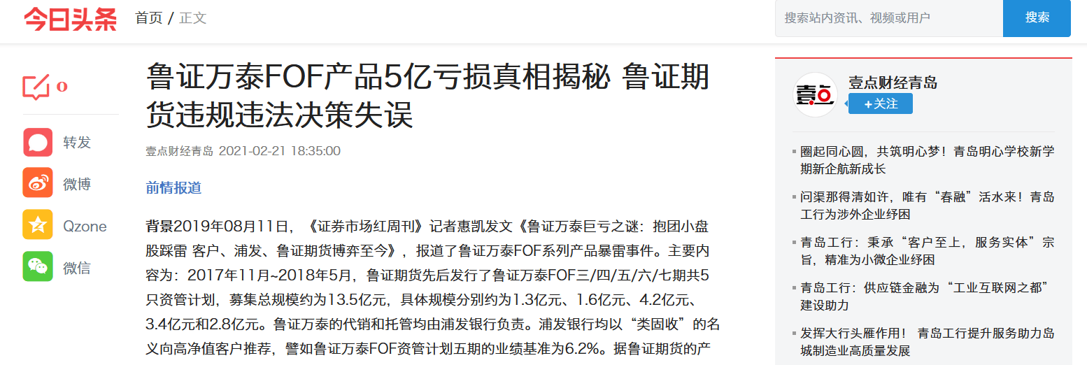 背景2019年08月11日,《证券市场红周刊》记者惠凯发文《鲁证万泰巨亏之谜:抱团小盘股踩雷 客户、浦发、鲁证期货博弈至今》,报道了鲁证万泰FOF系列产品暴雷事件。主要内容为:2017年11月~2018年5月,鲁证期货先后发行了鲁证万泰FOF三/四/五/六/七期共5只资管计划,募集总规模约为13.5亿元,具体规模分别约为1.3亿元、1.6亿元、4.2亿元、3.4亿元和2.8亿元。鲁证万泰的代销和托管均由浦发银行负责。浦发银行均以“类固收”的名义向高净值客户推荐,譬如鲁证万泰FOF资管计划五期的业绩基准为6.2%。据鲁证期货的产品推介材料介绍,这里的“类固定收益资产”是资管计划通过信托和私募基金,最终成为“股票配资优先级产品”。