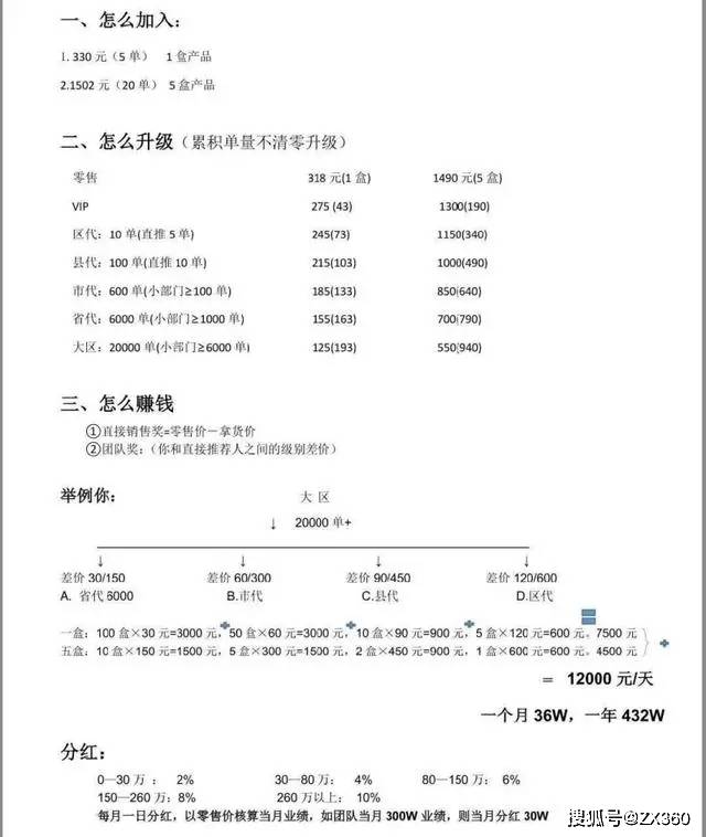 另外,表格还显示当前存在着“直接销售奖和团队奖”,其中,直接销售奖即零售价与拿货价的差额,而团队奖为你和直接推荐人之间的级别差价。还以大区代理举了例子:作为大区代理,若包含省代、市代、县代、区代等级别,销售一盒及五盒差价为30/150、60/300、90/450、120/600,若再分别乘以100/10、50/5、10/2、5/1盒的销售数量,一天就能获利12000元,一个月36万元,一年432万元。