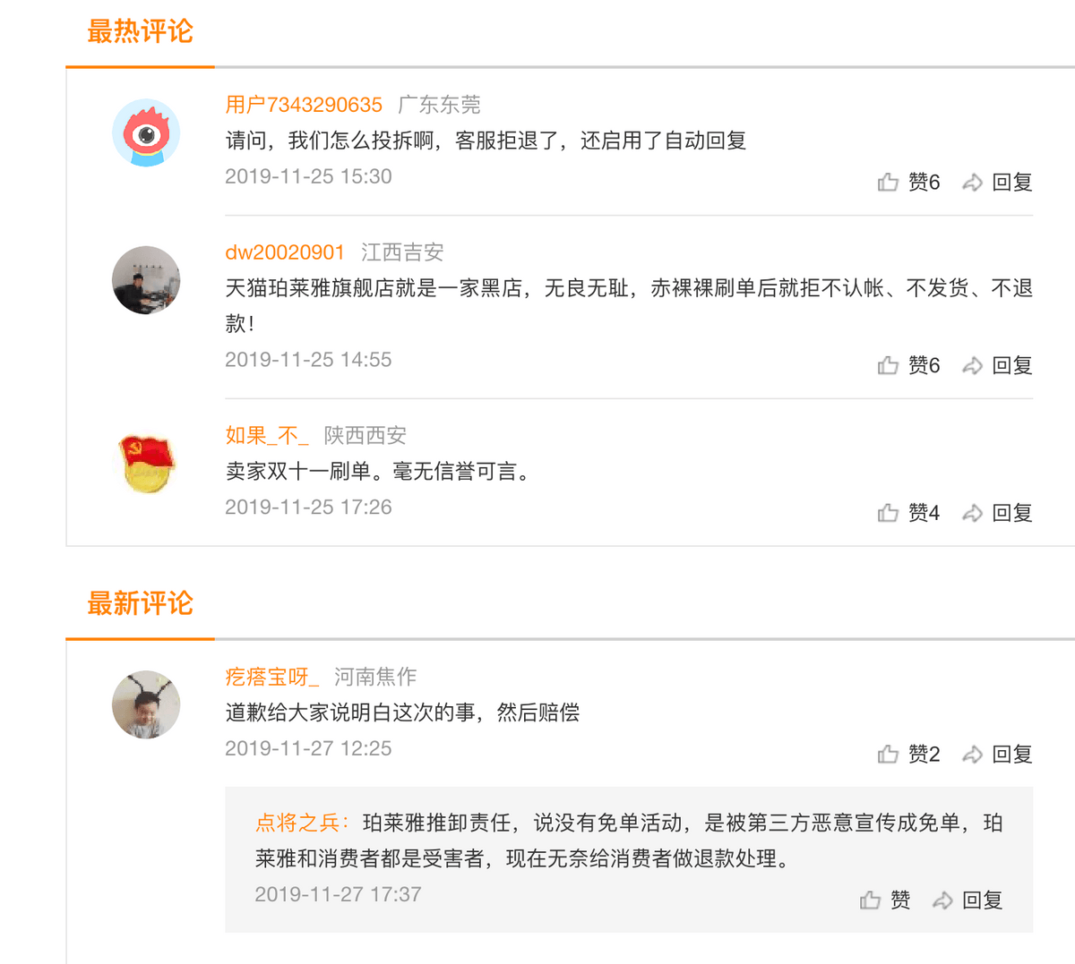 珀莱雅双11福袋免单活动遭遇的集体投诉情况及用户对此事件的部分评论
