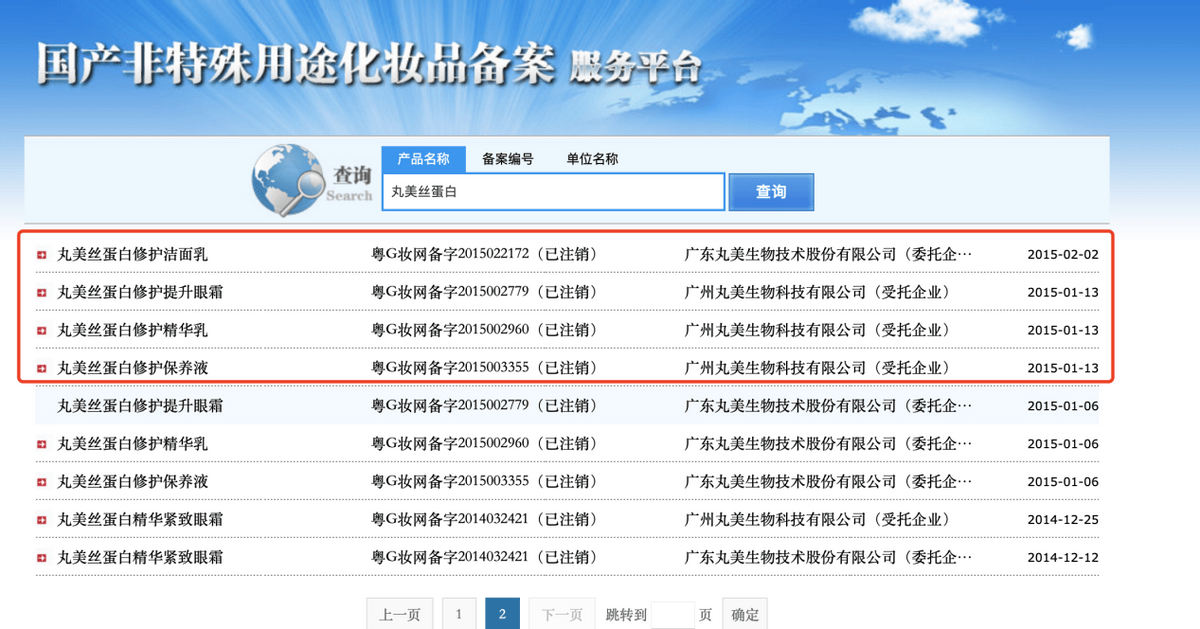 丸美股份丝蛋白修护系列产品的备案情况 图片来源:国产非特殊用途化妆品备案平台
