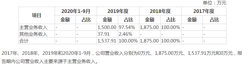 据招股书披露,海和药物的报告期为2017-2020年第三季度,其中2018年贵公司实现营业收入1875.00万元,2019年实现营业收入1537.91万元,2017年和2020年三季度的营业收入均为0万元。