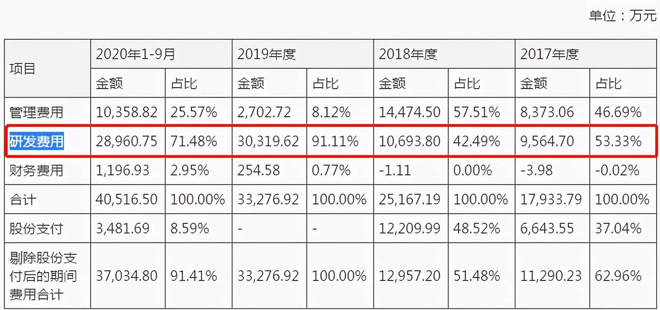 招股书显示,2017-2020年前三季度海和药物的研发费用分别为9564.70万元、1.07亿元、3.03亿元和2.90亿元,占期间费用的比例分别为53.33%、42.49%、91.11%和71.48%。研发费用占期间费用的比例过半,且远远大于当期的营业收入 。