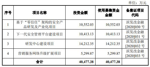 齐治科技原拟在上交所科创板公开发行股份数量不超过1200.00万股,拟募集资金4.05亿元,分别用于基于“零信任”架构的安全产品研发及产业化项目、下一代安全管理平台建设项目、研发中心建设项目、营销服务网络升级扩展项目。