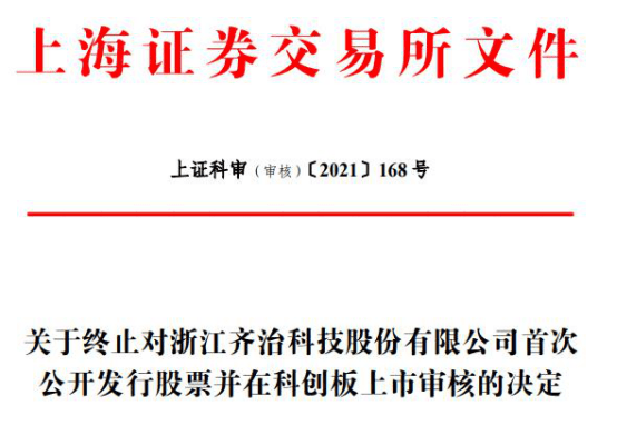 2021年3月11日,齐治科技保荐人招商证券股份有限公司向上交所提交了《关于撤回浙江齐治科技股份有限公司首次公开发行股票并在科创板上市申请文件的申请》(招证发[2021]121号),2021年3月11日,齐治科技向上交所提交了《浙江齐治科技股份有限公司关于撤回首次公开发行股票并在科创板上市申请文件的申请》(齐治[2021]第10号),申请撤回申请文件。根据《上海证券交易所科创板股票发行上市审核规则》第六十七条的有关规定,上交所决定终止对齐治科技首次公开发行股票并在科创板上市的审核。