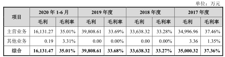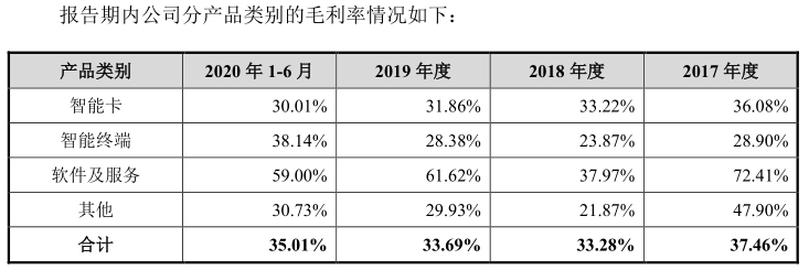 此外,楚天龙智能卡业务的毛利率也发生了明显的变化,2017-2019年,其毛利率分别为36.08%、33.22%、31.86%,2020年上半年,智能卡业务的毛利率下降到30.01%。而智能卡业务毛利率的下滑,也导致了楚天龙综合毛利率的下滑,已由2017年的37.36%下滑至2019年的33.68%,虽在2020年上半年其毛利率有所回升,但还是不及2017年。