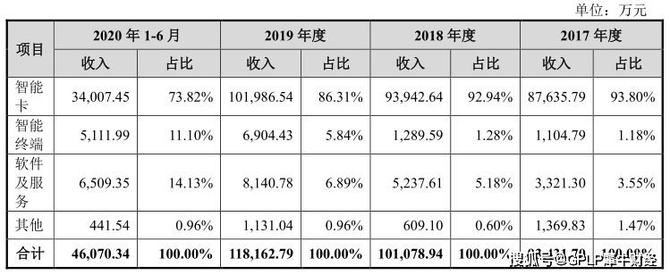 2017-2019年,楚天龙智能卡的销售收入占比分别为93.80%、92.24%、86.31%,2020年上半年,智能卡销售收入占比为78.32%。由此可见,楚天龙核心产品智能卡的销售收入占比在逐渐降低。