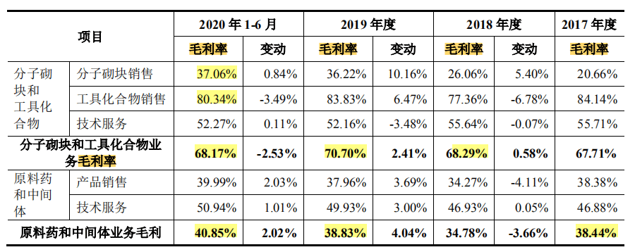 从毛利率上看,2017年-2020年1-6月年分子砌块和工具化合物的毛利率分别为67.71%、68.29%、70.70%和68.17%;原料药和中间体毛利率分别为38.44%、34.78%、38.83%和40.85%。