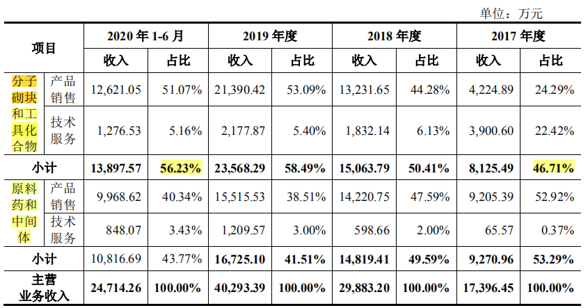 权衡财经iqhcj注意到2017-2020年1-6月,公司的分子砌块和工具化合物业务营业收入分别为0.81亿元、1.51亿元、2.36亿元和1.39亿元,营收占比分别为46.71%、50.41%、58.49%和56.23%;原料药和中间体业务分别实现营业收入0.93亿元、1.48亿元、1.67亿元和1.08亿元,营收占比分别为53.29%、49.59%和41.51%。分子砌块和工具化合物贡献了接近六成收入,且所占比重近三年逐年递增;而原料药和中间体收入占比近三年逐年递减。