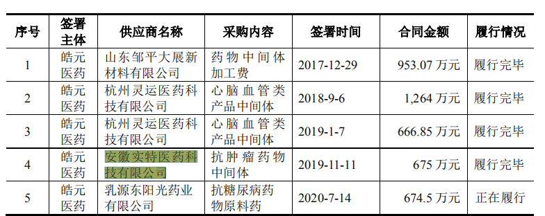 皓元医药与安徽实特医药科技有限公司于2019年11月11日签订675万元医药中间体的采购合同,根据公开资料显示,安徽实特医药科技有限公司成立于2019年9月2日,社保缴纳人数为0人,仅仅成立2个月或不具备生产能力,但此合同却显示已经履行完毕。