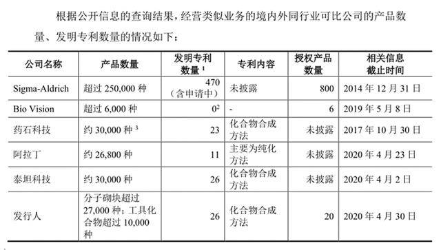 皓元医药表示,工具化合物申请专利保护首先需要满足新颖性、创造性、实用性等条件,才有可能取得相关专利。分子砌块申请化合物专利需要与其合成目的(即用于合成哪种活性分子)、合成方法(即合成活性分子的合成路线)合理相关,取得专利授权的难度较大,因此,分子砌块(中间体)通常无专利保护。可比公司情况如下表所示: