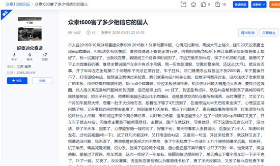 车主在论坛发帖吐槽众泰T600