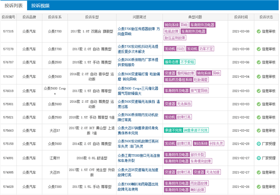 众泰汽车部分投诉