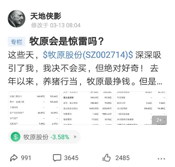 过于优秀的业绩引起了投资者的兴趣。一位雪球的球友“星辉雪夜”是牧原股份的重仓者,过去一段时间,他不断找到“天地侠影”帮忙看看“牧原的财报有没有问题”。于是在3月13日这天,“天地侠影”一篇《牧原股份会是惊雷吗》横空出世,引发网友热议,券商解释,牧原股份市值下跌。