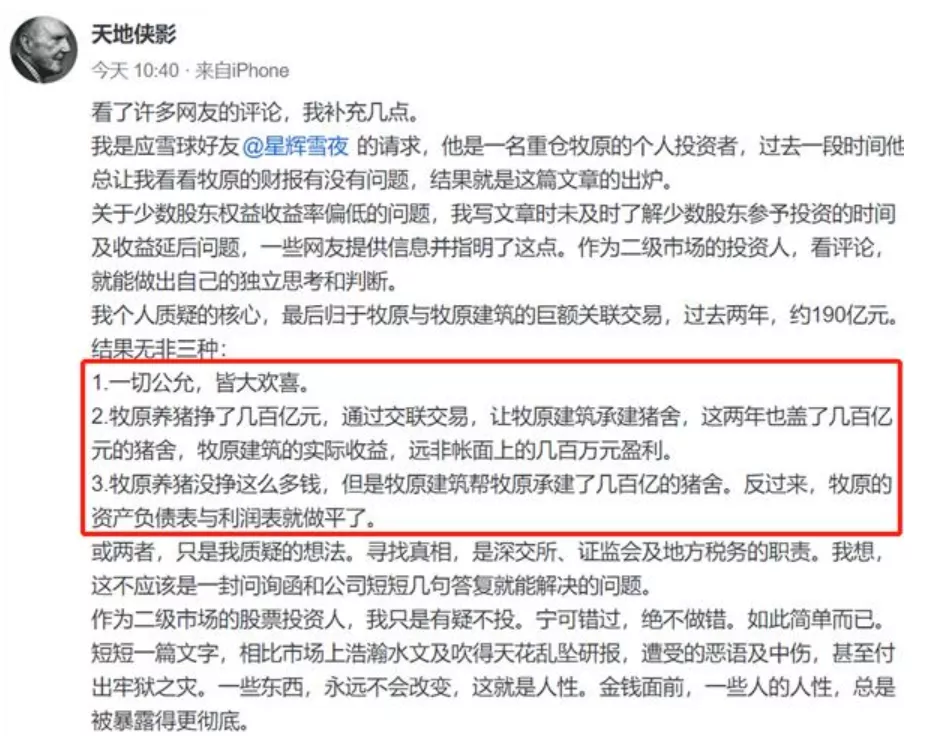 随后, “天地侠影”表示,写文章时没有及时了解少数股东参与投资的时间及收益延后问题。但对于“盖猪圈”的关联交易,仍保持质疑,认为可能存在三种情况:一种是一切公允,皆大欢喜;另一种是牧原股份养猪赚到几百亿元,通过关联交易让牧原建筑承建猪舍,牧原建筑也盖了几百亿元猪舍,实际收益不止账面上的几百万元;还有一种可能,是牧原股份养猪没有其财报中显示的那么挣钱,但是通过牧原建筑关联交易盖了几百亿元的猪舍,将资产负债表与利润表做平了。