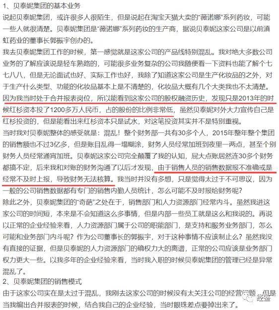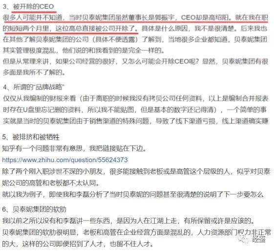 另据一位自称贝泰妮原财务员工2019年公开发帖表示,公司产品线混乱,大量的销售费用用在“打理”与医院和医生的关系上,甚至销售部门与人力资源部门内斗不止,CEO高绍阳还曾被开除等。该文章称,贝泰妮还存在非法删帖行为。