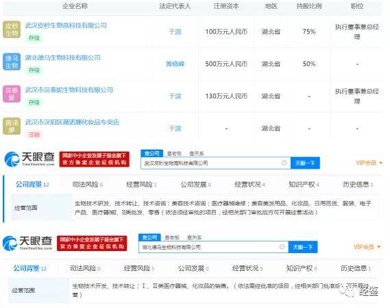值得注意的是,于滨同时还担任武汉皮秒生物高科技有限公司法人,此外还控股湖北德马生物科技有限公司,工商资料显示,这两家公司营业范围与贝泰妮均有较大的重合,属于同业公司。