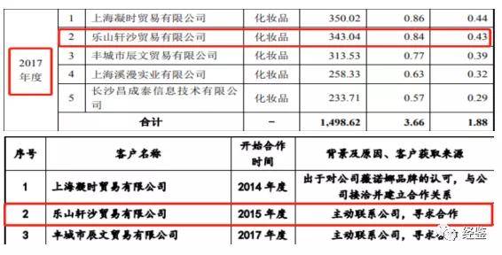 招股说明书披露,2017年贝泰妮线上经销商模式下的第二大客户为乐山轩沙贸易有限公司(以下简称“轩沙贸易”),当年交易金额343.04万元。贝泰妮表示,公司与其开始合作时间是2015年度,是轩沙贸易主动联系寻求合作。