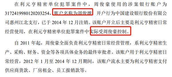 另外,在利元亨精密单位犯罪中,周俊豪所使用涉案中国建设银行账户,账户名称为周俊雄,为周俊雄所开立。利元亨表示。该账户开立后主要是利元亨精密日常经营使用,并未被周俊雄个人使用,实际用于利元亨精密日常经营,并由周俊豪实际控制。