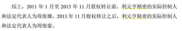 利元亨表示,周俊雄在2011年至2013年11月股权转让前虽然为利元亨精密的控股股东、实际控制人和法定代表人,但由于其负责总体把控公司业务和研发的战略和方向,并不负责利元亨精密具体的生产、采购、财务等日常经营管理事项,周俊雄在案发前对周俊豪实施的犯罪行为并不知情。