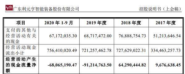 再来看现金流。2019年至2020年前9个月开始,利元亨经营活动产生的现金流净额分别为-9121.48万元、-6806.52万元,投资活动产生的现金流净额分别为-8067.17万元、-12053.72万元,筹资活动产生的现金流净额分别为7379.57万元、42559.66万元。除筹资活动外,经营活动、投资活动现金流净额均为负数,这意味着公司的经营活动不赚钱,而且还在不断地投资扩张,主要通过筹资来补血。不知道公司是否考虑过一旦融资不畅后可能面临的处境?