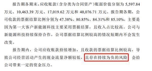 另外,2017年至2020年前9个月,公司应收账款(含分类为合同资产)账面价值分别为5597.84万元、10463.39万元、17019.62万元和40076.71万元。报告期各期,公司收款的票据结算比例分别为47.38%、80.85%、84.31%和85.1%,主要是因为第一大客户新能源科技主要采用票据结算,且收入占比较高。公司与新能源科技持续保持合作,公司票据结算比例较高的情况短期内不会发生改变。导致公司经营活动产生的现金流量净额较低,且存在持续为负的风险。这是否意味着,前述靠筹资推动的公司经营仍将长期持续?长此以往,何以为继?
