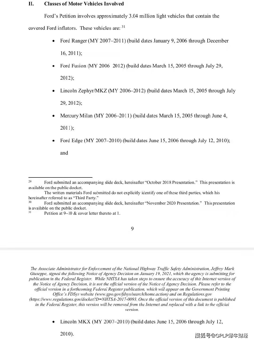 据公告,NHTSA表示,福特汽车涉及高田气囊的车辆品牌包括:2007-2011年款的Ford Ranger,2006-2012年款的Ford Fusion、Lincoln Zephyr、Lincoln MKZ,2006-2011年款的Mercury Milan,2007-2010年款的Ford Edge、Lincoln MKX。