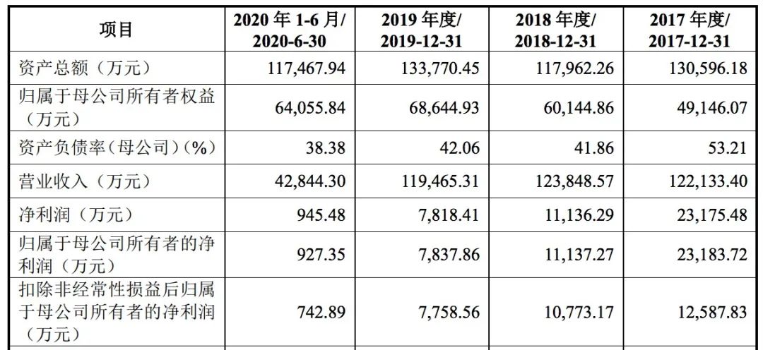 2017年、2018年、2019年、2020年上半年报告期内,上声电子营业收入分别为12.21亿元、12.38亿元、11.95亿元和 4.28亿元,归母净利润分别为2.31亿元、1.11亿元、7837.86万元和927.35万元,利润逐年下滑。