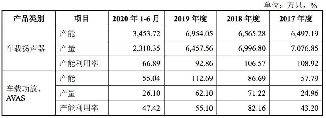 不过,时间财经查阅发现,2017年、2018年、2019年、2020年上半年报告期内,上声电子车载扬声器产能利用率分别为 108.92%、106.57%、92.86%和 66.89%,车载功效、AVAS产能利用率分别为43.2%、82.16%、55.10%和47.42%。