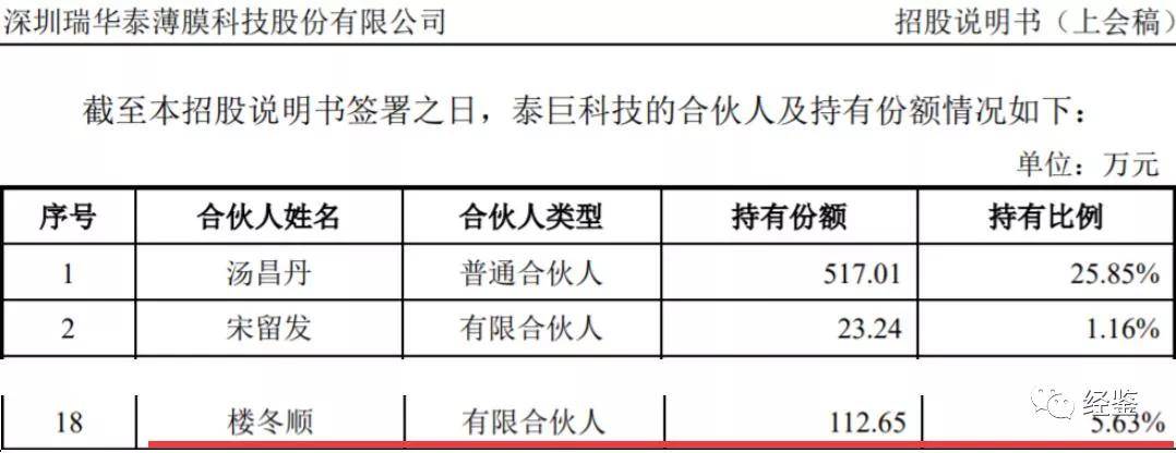 据招股说明书披露,楼冬顺先生为瑞华泰员工持股平台泰巨科技有限合伙人之一,占股5.63%。