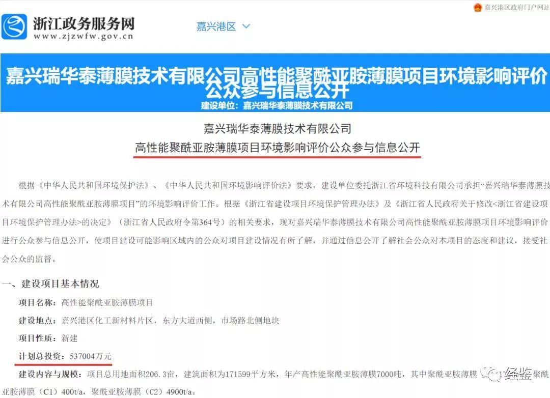 值得注意的是,瑞华泰本次募投项目总投资金额为130,037.09万元,而据浙江政务服务网公示的相关参数显示,该项目总投资额为537004万元。