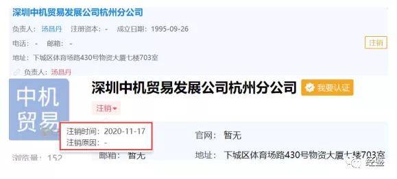 此外,据工商资料显示,瑞华泰副董事长为汤昌丹先生,其曾为深圳中机贸易发展公司杭州分公司负责人,该司注销于2020年11月17日。