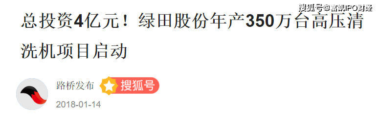 据2018年1月的媒体报道,《总投资4亿元!绿田股份年产350万台高压清洗机项目启动》一问中提到,2018年1月14日上午,绿田机械股份有限公司(简称“绿田股份”)年产350万台高压清洗机项目奠基典礼,在绿田股份新基地举行。区领导潘建华、叶帮锐、戴冬林、杨剑、梁妙富、王侃参加典礼。区委书记潘建华宣布绿田股份年产350万台高压清洗机项目正式启动。