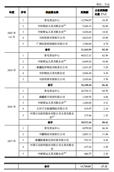 其中,炬申物流的第一大供应商为奎屯货运中心,2017年-2020年上半年,炬申物流向奎屯货运中心的采购额分别为8078.90万元、2.68亿元、4.08亿元和1.28亿元,占当期总采购额的比例分别为46.34%、69.78%、62.89%和34.87%,占比较高。