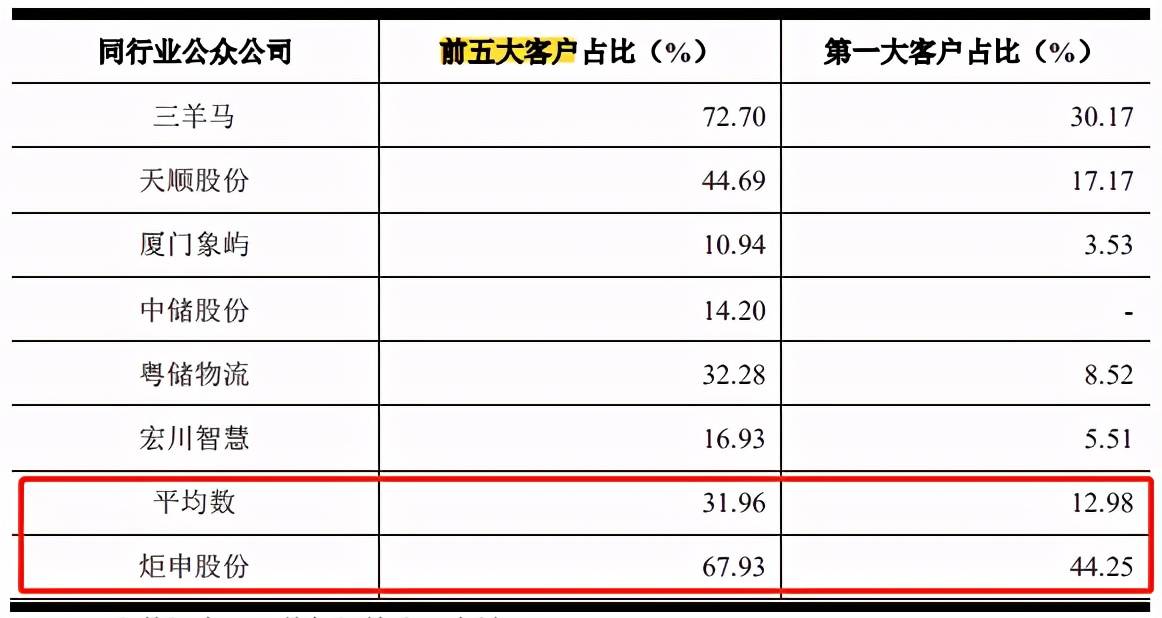 炬申物流在招股书中解释称,公司专注有色金属运输及仓储综合业务,目前同行业公众公司中,不存在与公司业务类型及结构完全可比的公众公司,同行业公众公司业务重点、业务结构和业务运行模式等与发行人有所不同,相关同行业公众公司下游客户的集中度及区域集中度均较低,从而导致其与公司在客户集中度情况上有所不同。
